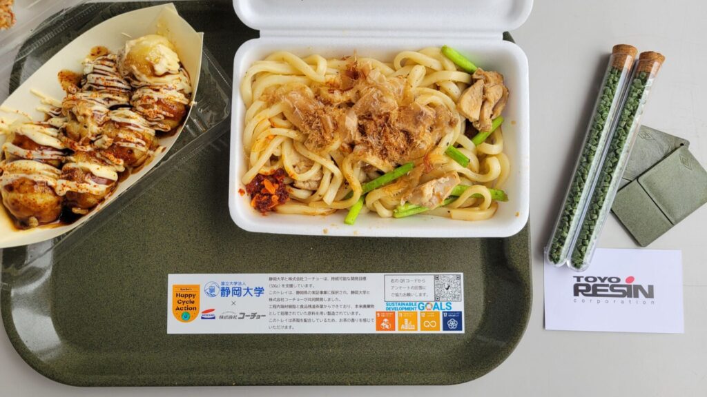 本プロジェクトでは、これまで処分するしかなかった茶殻と、弊社の製造工程で発生する端材プラスチックを組み合わせ、混錬(コンパウンド)技術により射出成型用ペレットの開発に成功いたしました。このペレットを使用した食品トレイは、廃棄物に新たな価値を生み出す環境配慮型アップサイクル製品として実用化されています。